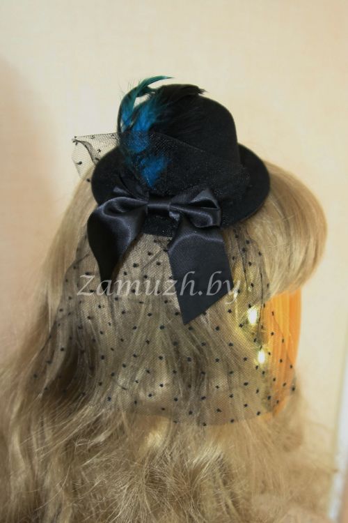 Декоративная, миниатюрная шляпка из фетра черного цвета с вуалью, декоративными перьями и бантом из атласной ленты. С креплениями (на заколках).